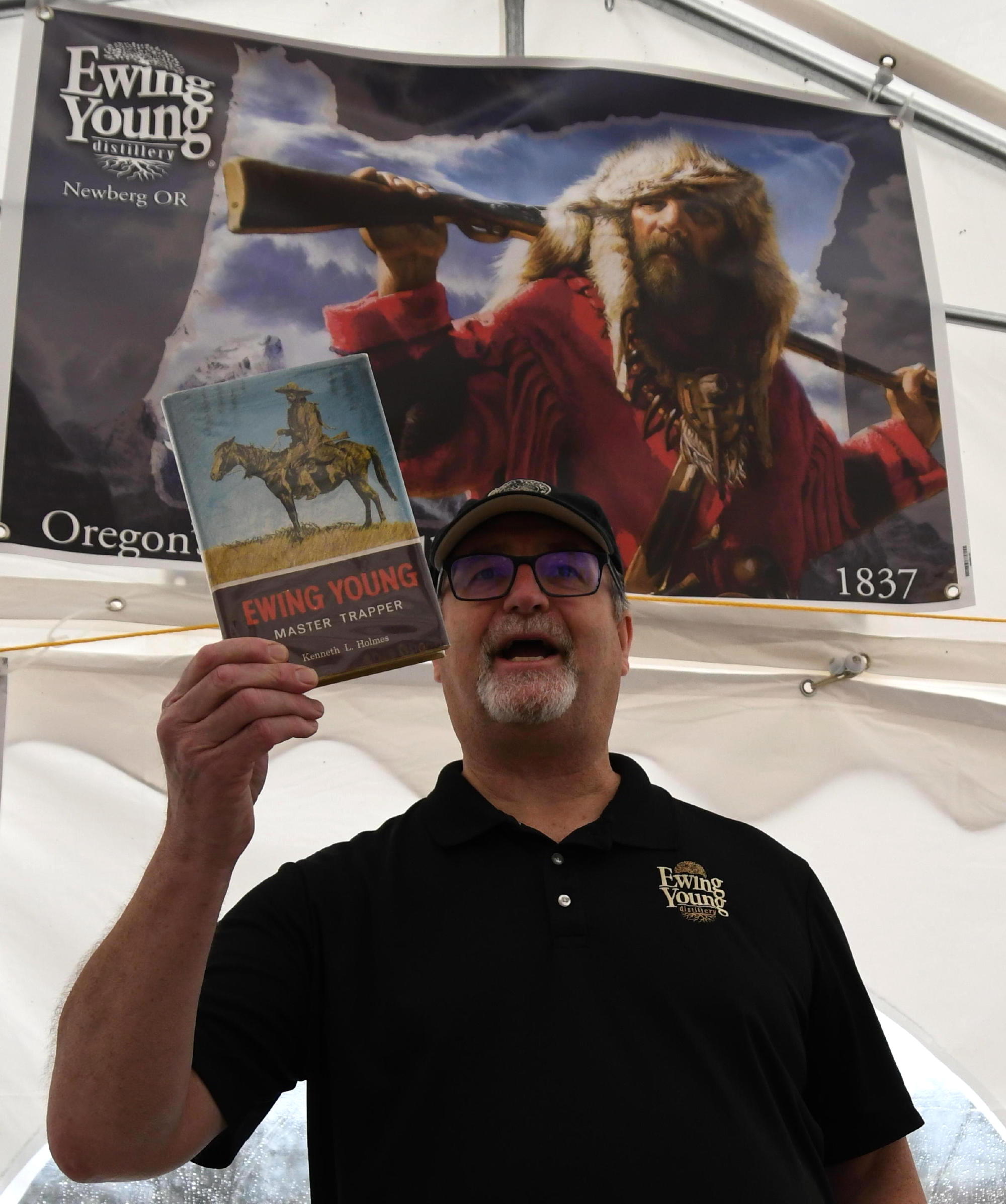our primary presenter for the meeting with a HIGHLY ENTERTAINING story about the place and its namesake…Ewing Young…Chehalem Valley pioneer, buried a short distance away under an oak tree.  Copies of the book Doug is holding ARE available at the Newberg Public Library…. confirmed by Leah.  Doug is a fascinating story-teller…and he regaled us with many anecdotal accounts from Ewing Young’s life.  It is highly suggested to not only read the book, but to visit the distillery during regular open hours to listen to more of Doug’s stories….not only of Ewing Young, but the history of the Chehalem Valley in the early years of European-American settlement.  Their website is FULL of interesting historical “tid-bits”… including hours of operation…check it out!
